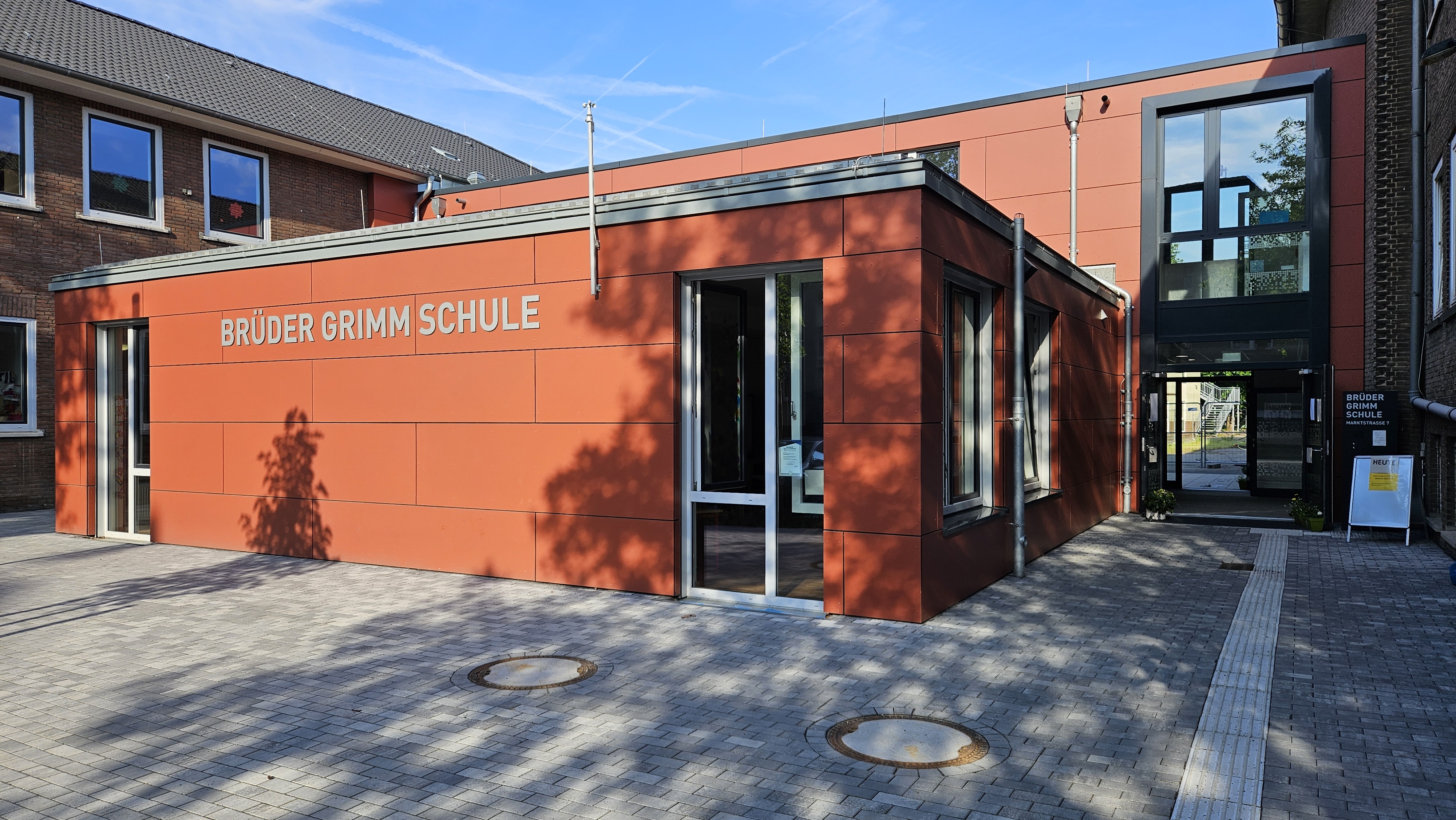 Nach bereits erfolgter Fertigstellung der Aula konnte nun auch der neue Haupteingang eröffnet werden. Daher ändert sich auch ab sofort die Anschrift unserer Schule. Aus Zastrowstraße 19-21 wird Marktstraße 7.