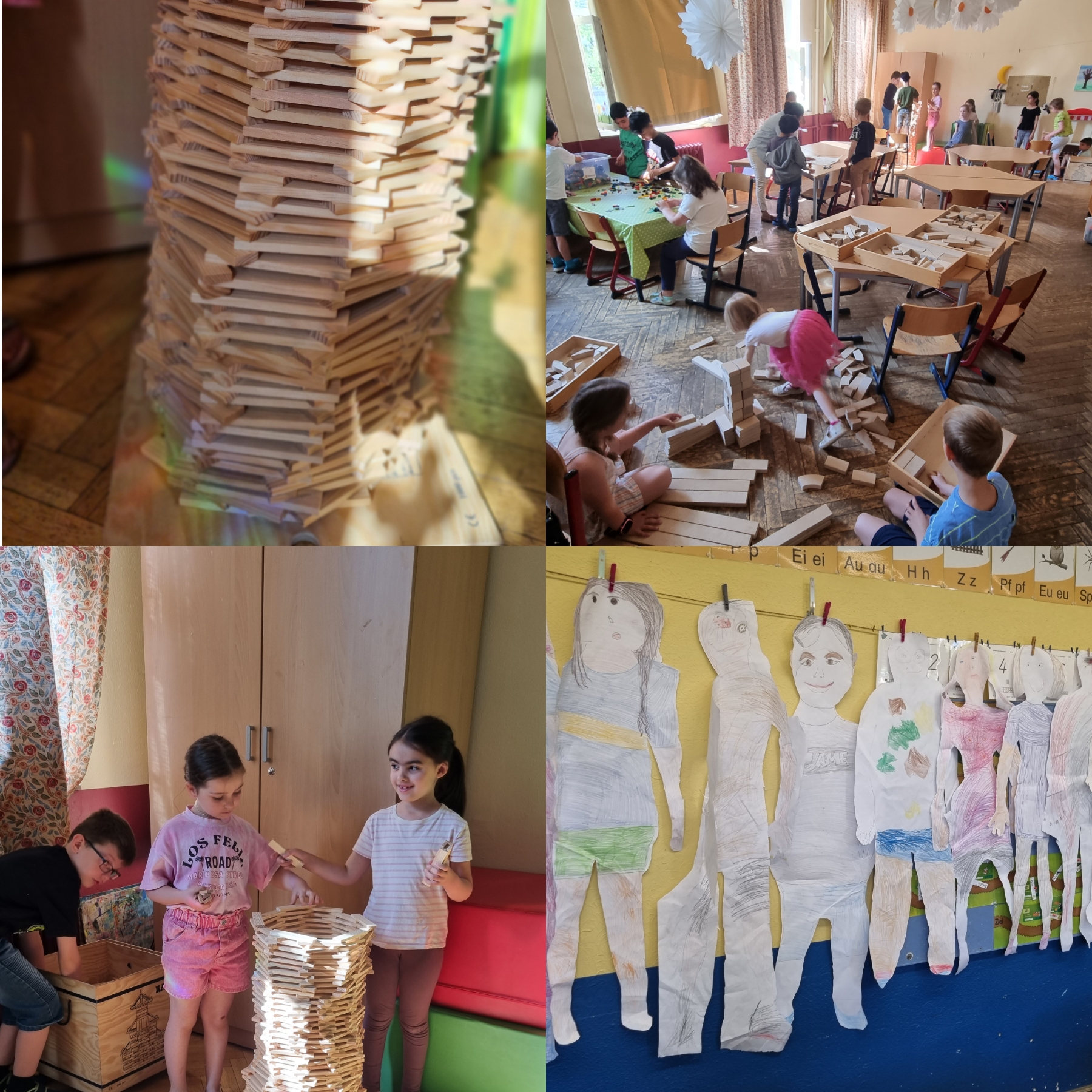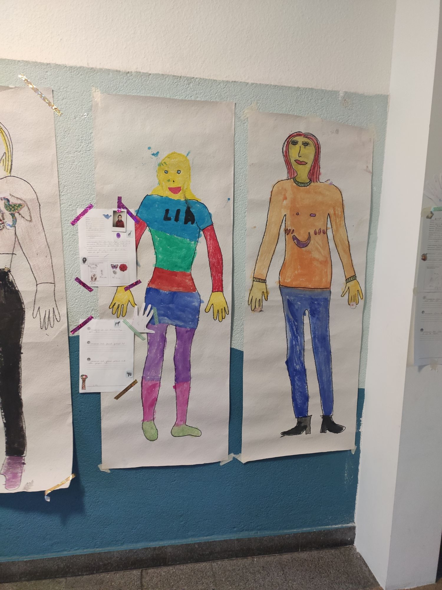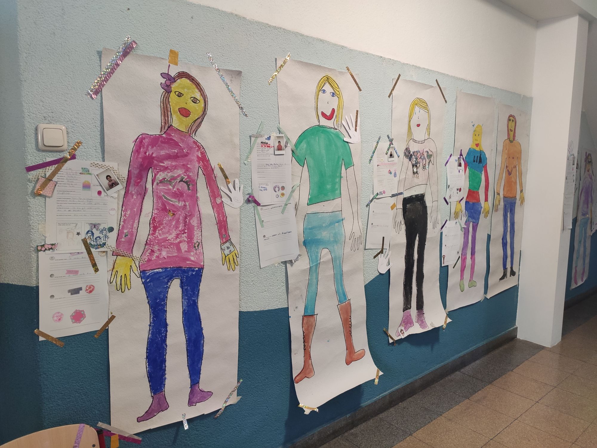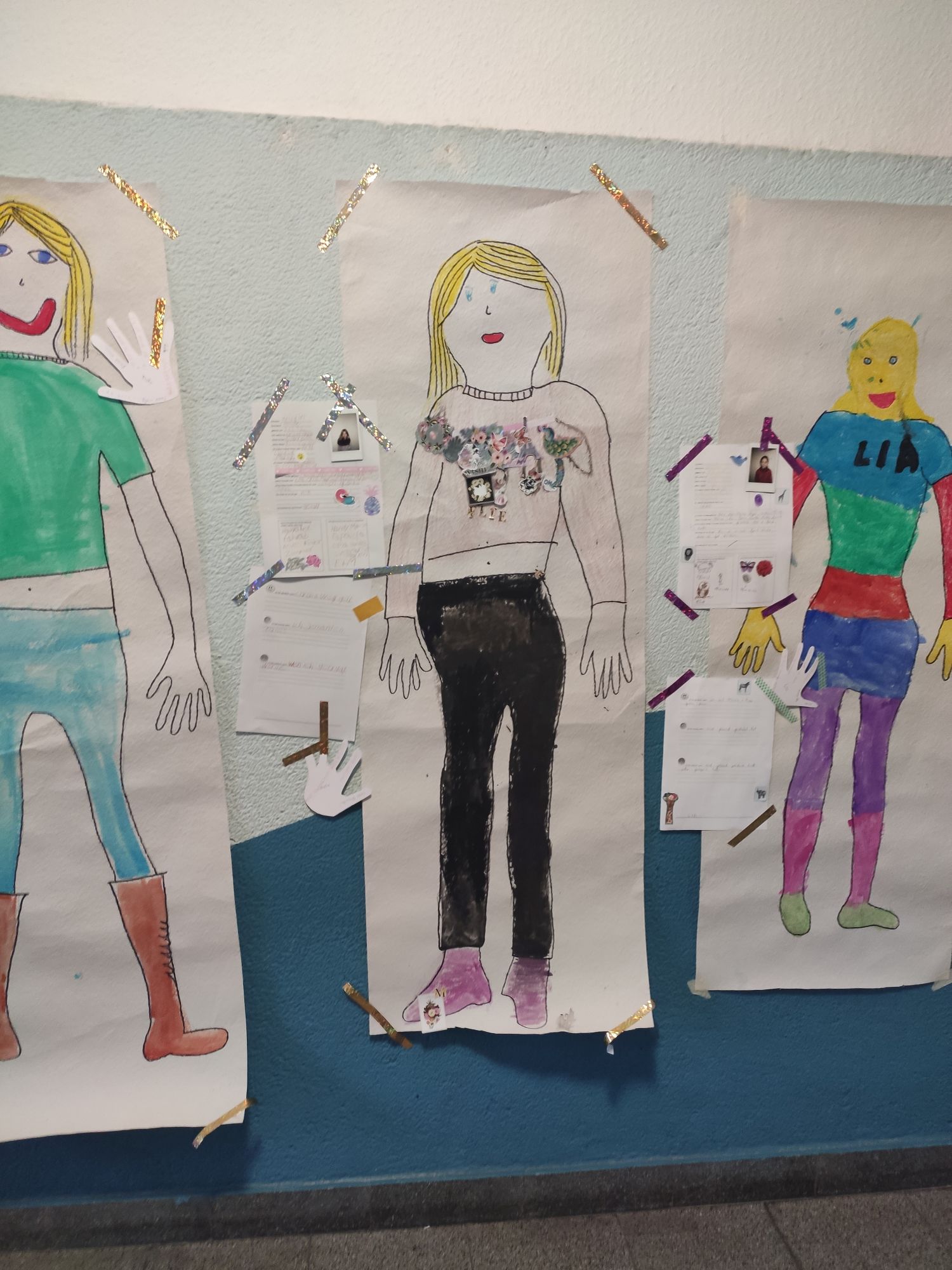 Die Kinder haben ihre Körpersilhouette auf Tapete gezeichnet und diese dann gestaltet. Die Kinder haben sich alle sehr farbenfroh und mit viel Freude ausgemalt und sich dabei z.B. an Hobbies orientiert (Mieke in Reiteroutfit, Rami in Fußballkleidung).