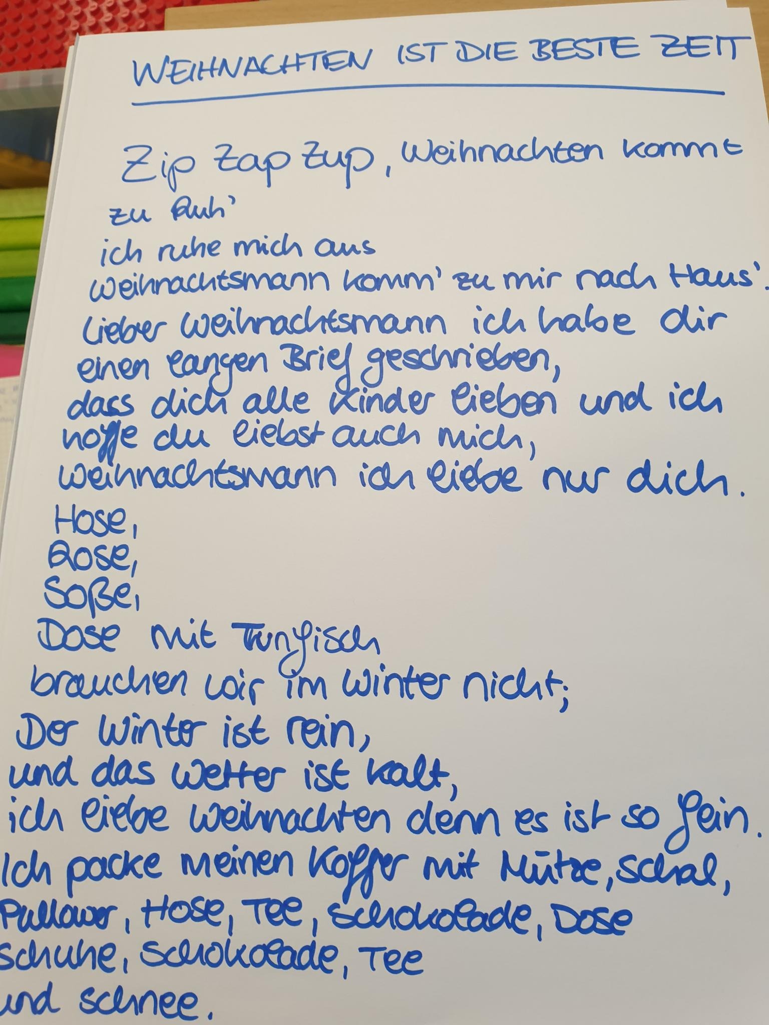 Dazu haben die Kinder einen Steckbrief (mit Fotos) ausgefüllt, welcher sich weniger mit den klassischen Fragen denn mit Fragen der eigenen Gefühlswelt beschäftigte. Z.B.: „Was würde ich mir wünschen, wenn ich drei Wünsch von einer guten Fee bekommen würde?“ oder „besonders glücklich fühle ich mich, wenn…“!